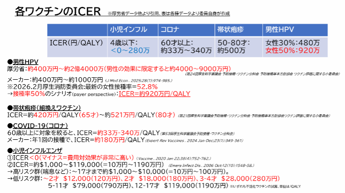 このような中で男性接種を導入する場合、女性への感染予防による「間接効果」は相対的に小さくなり、費用対効果は悪化する傾向にあります(補足資料)。一方で、定期接種として実施されているワクチン(例えばコロナ、帯状疱疹、肺炎球菌ワクチンなど)は一定の費用対効果が実証されています。